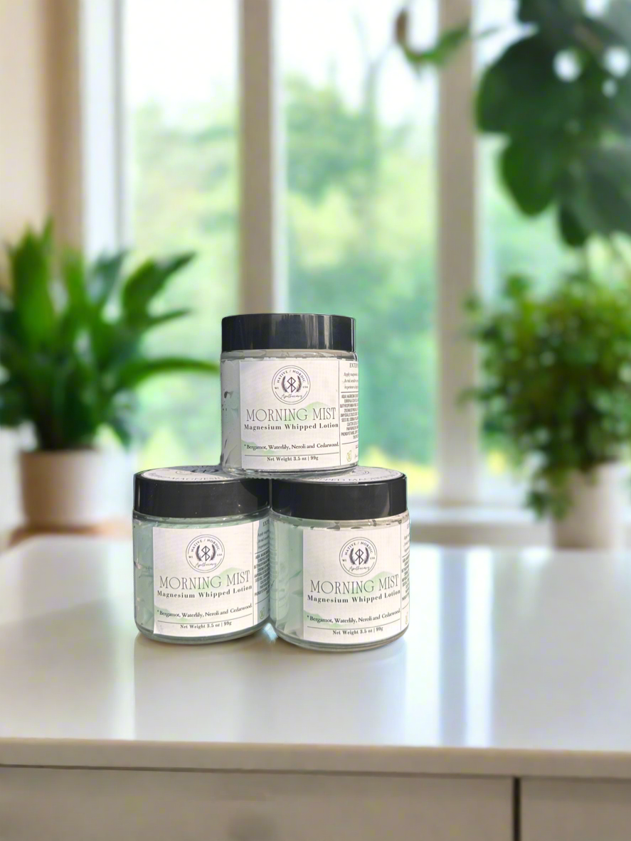 Experience the refreshing embrace of Morning Mist, a whipped magnesium body lotion that combines the soothing power of Magnesium Chloride with deeply nourishing botanicals, vitamins, and minerals. This luxuriously whipped formula glides onto the skin with a smooth, lightweight texture, leaving you hydrated, balanced, and refreshed.
