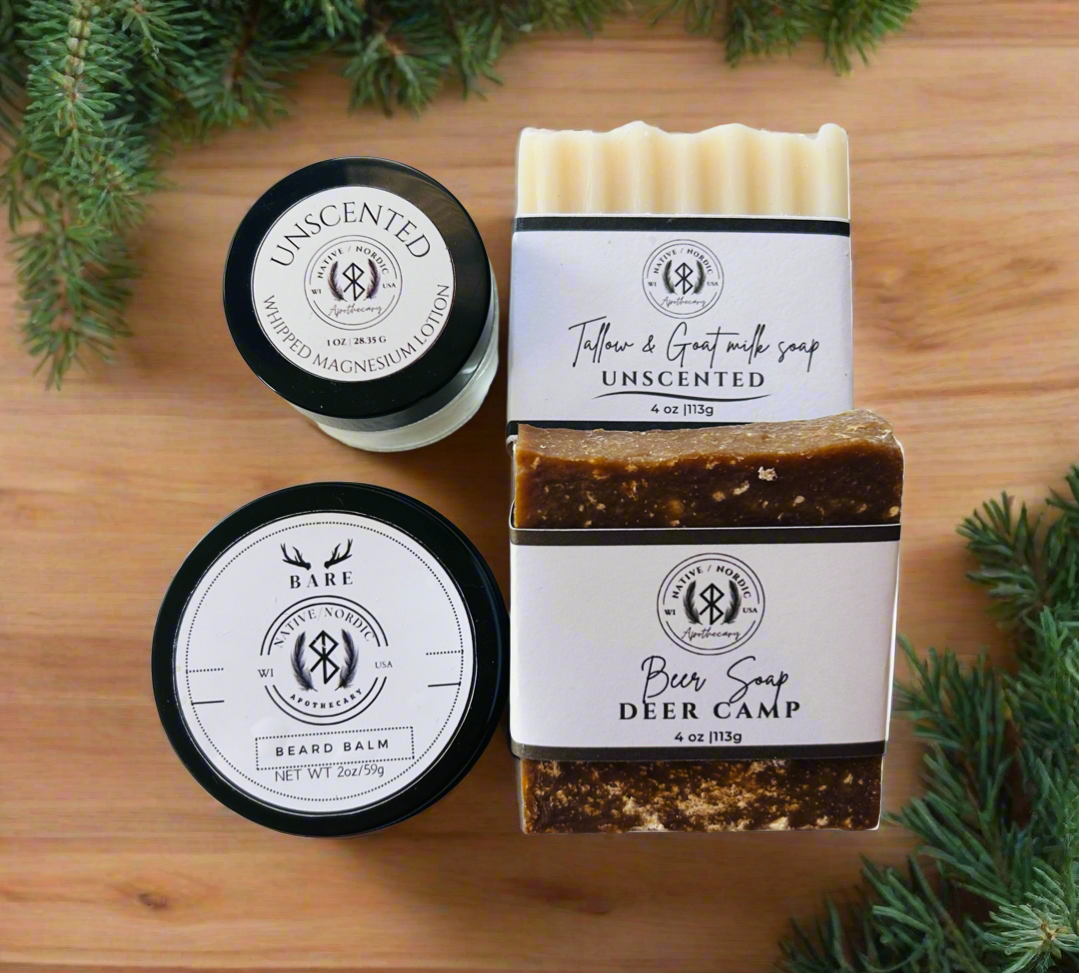 Beer (Leinenkugel’s®), Bos Taurus (Grass-Fed Beef Tallow), Cocos Nucifera (Coconut) Oil, Butyrospermum Parkii (Shea Butter), Olea Europaea (Olive) Fruit Oil, Pine Tar, Ricinus Communis (Castor Seed) Oil (Cold-Pressed), Sodium Hydroxide (Food Grade Lye), Mica, Kaolin, Local Honey, Pumice, Pinus Sylvestris (Pine Needle) Oil, Cedrus Atlantica (Cedarwood) Bark Oil.