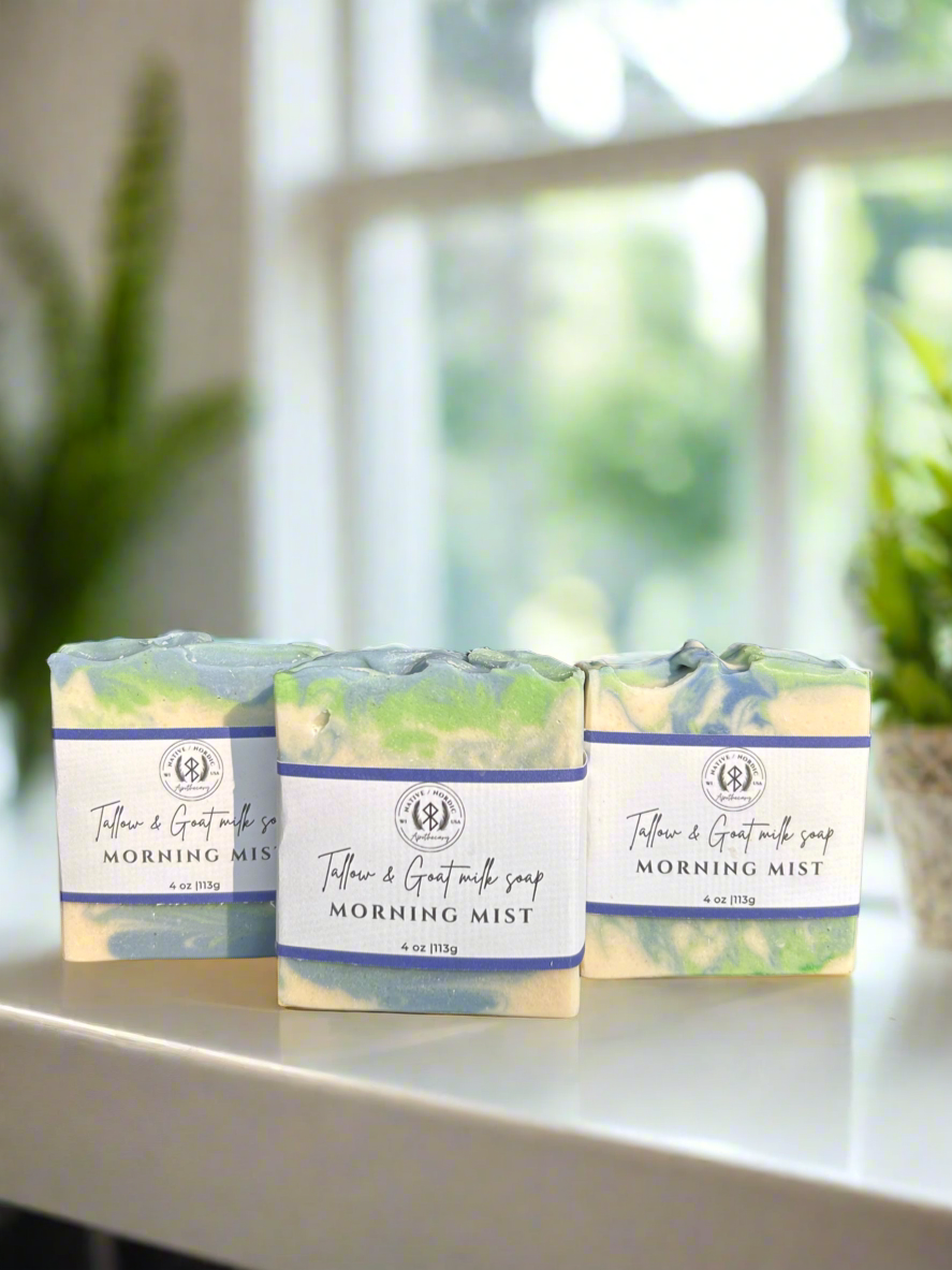 Evoke the freshness of dawn with our Morning Mist Soap, a cold-processed bar handcrafted in the apothecary tradition. Infused with raw goat milk, nourishing butters, and a bright botanical fragrance, this soap awakens the senses while gently cleansing the skin. The airy blend of bergamot, waterlily, neroli, and cedarwood captures the stillness of morning air drifting through blossoming gardens and quiet woods.